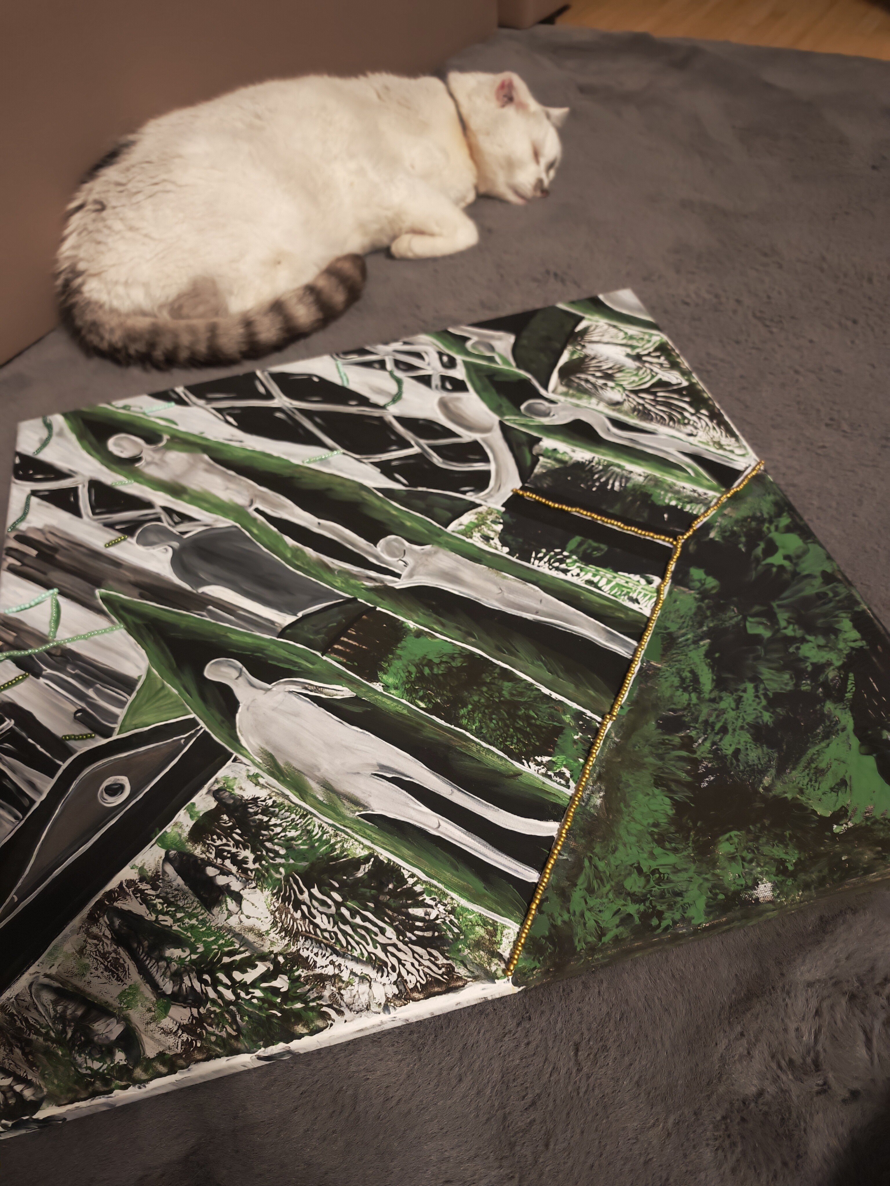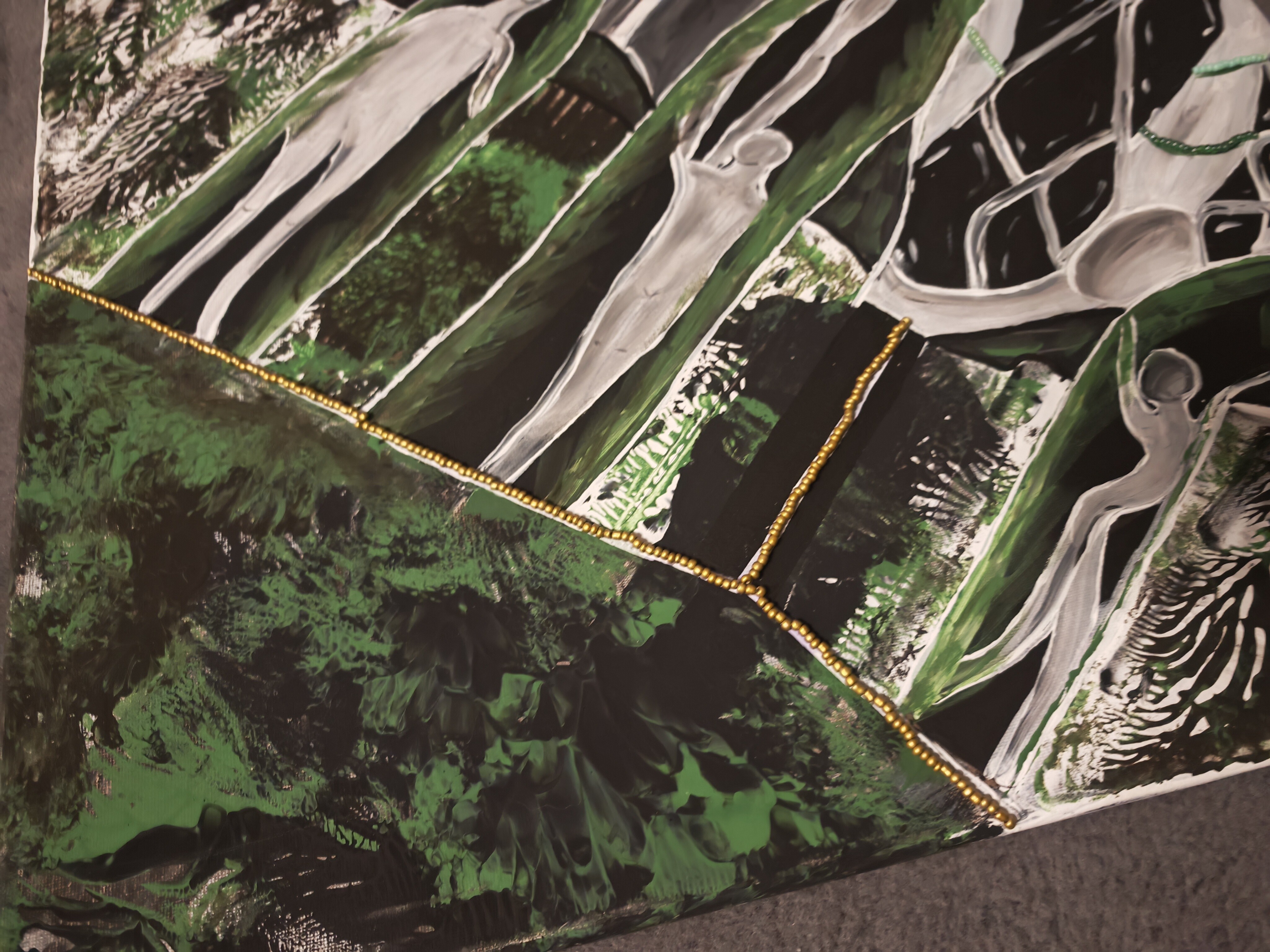 The artwork features ethereal, ascending figures set against a backdrop of organic green forms and architectural lines. To enhance its depth, the piece is meticulously finished with intricate bead embroidery, creating a tactile experience that catches the light beautifully.