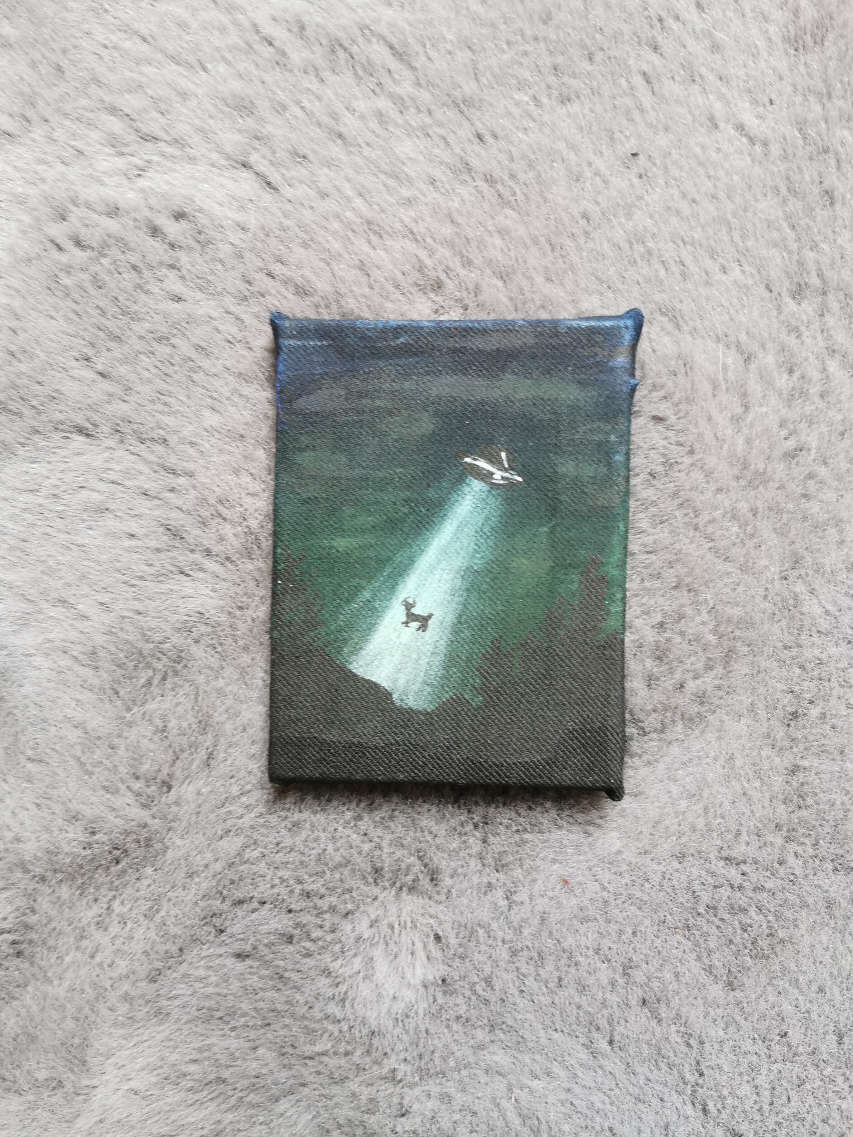 "Midnight Encounter": An intriguing UFO scene under a dark sky, with a light beam illuminating a tiny figure.