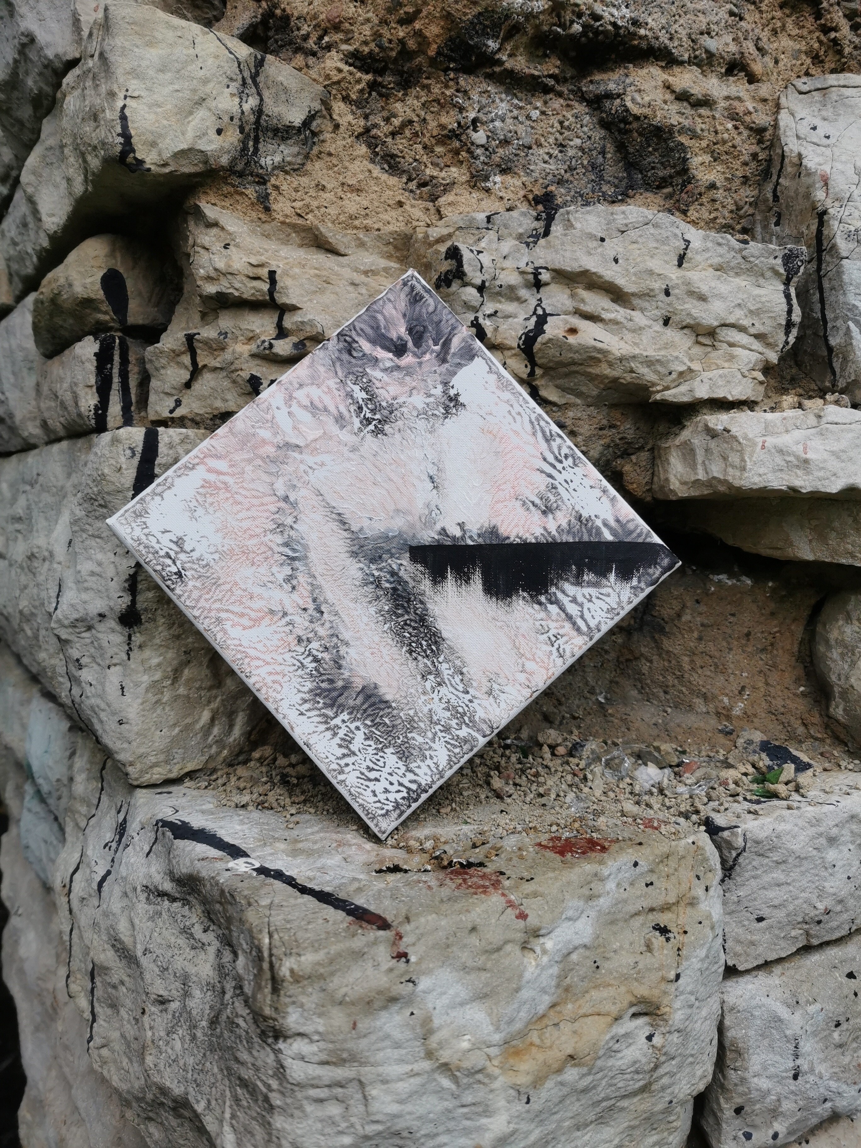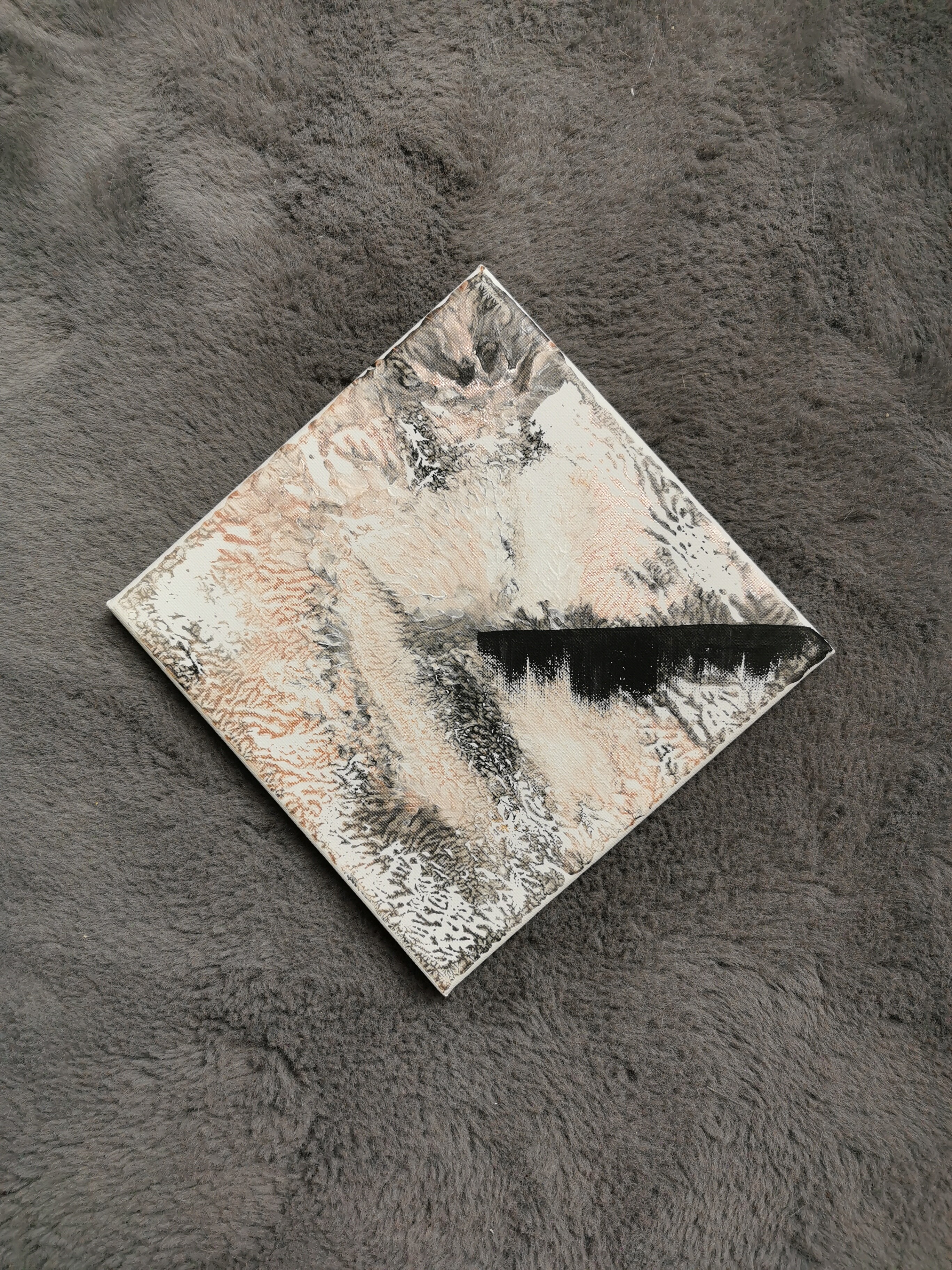 "Duality" is a striking original acrylic painting on canvas that invites contemplation. Presented on a 20cm x 20cm (approximately 8 x 8 inches) canvas, this piece features an intricate interplay of soft, organic textures in shades of off-white, muted rose, and subtle grays. These gentle, flowing patterns are dramatically intersected by a bold, sharp black line, creating a powerful visual tension—a dialogue between delicacy and definition, the fluid and the fixed.