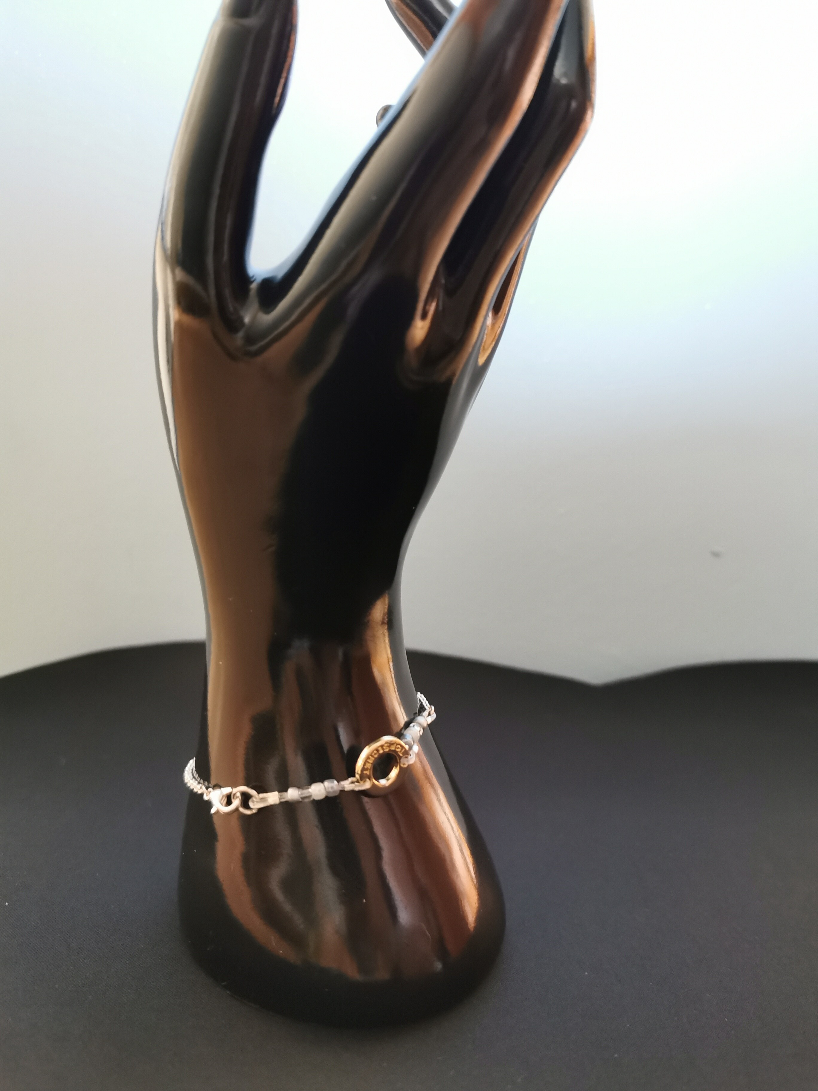 Add a touch of subtle elegance to your wrist with this charming beaded bracelet. Crafted with a delicate silver-tone chain, it features an appealing mix of clear, silver, and grey beads that catch the light beautifully. The centerpiece is a stylish gold-tone ring, adding a sophisticated contrast and a modern touch to the design. This versatile bracelet is perfect for everyday wear, effortlessly complementing both casual and more formal attire. It's secured with a lobster clasp, ensuring a comfortable and secure fit. Ideal as a thoughtful gift or a delightful addition to your own jewelry collection.