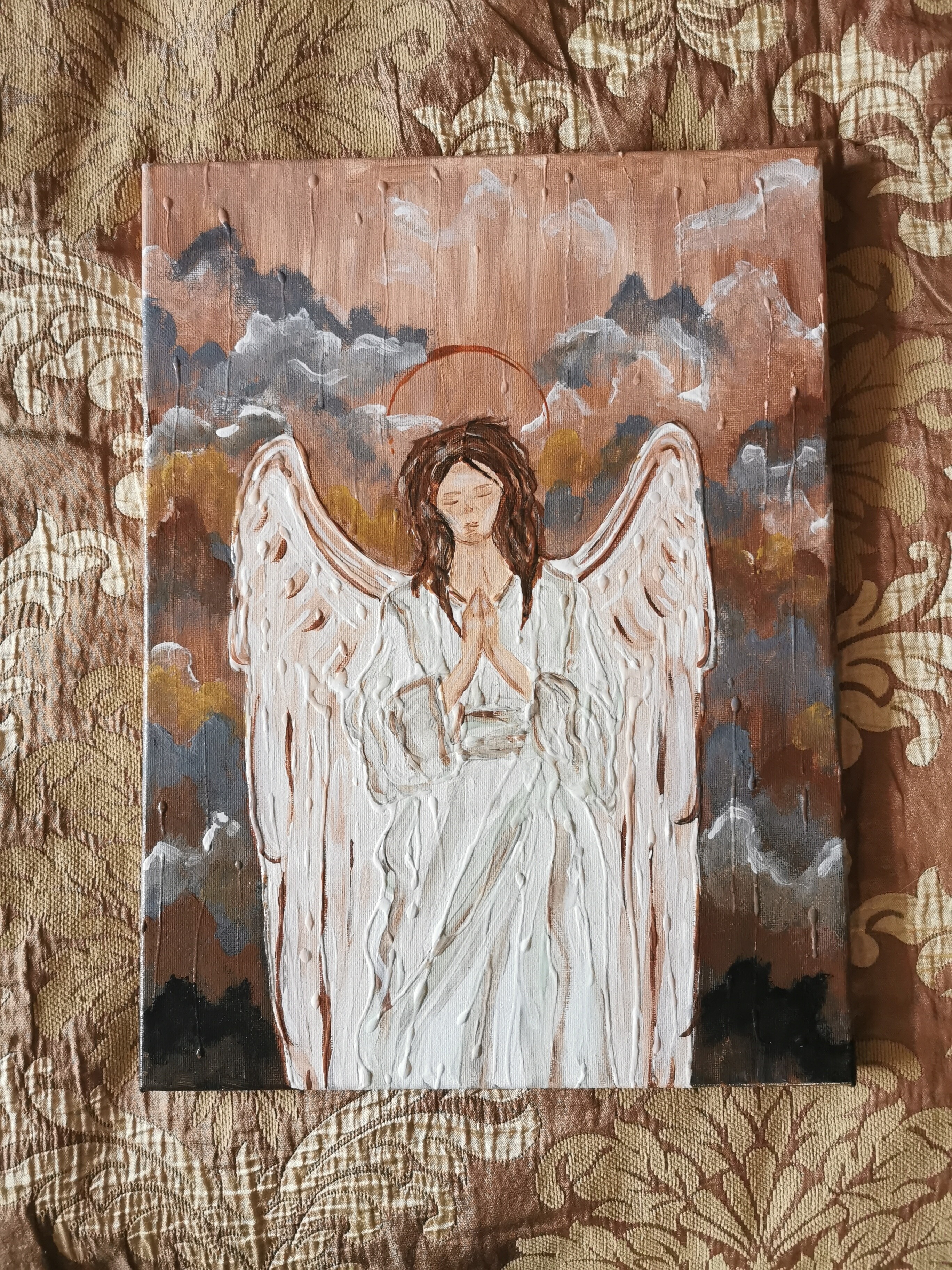 This evocative painting features a serene angel with broad, feathery wings, her hands clasped in prayer. A subtle halo glows above her head, symbolizing divine grace. The background is a textured blend of warm earthy tones and soft grays, suggesting a sky filled with both light and shadow, perhaps a tranquil dusk or dawn. The angel's expression is peaceful and contemplative, inviting a sense of calm and spiritual reflection. Her simple white robe flows gracefully, complementing the rustic, textured style of the piece. This artwork evokes feelings of peace, protection, and gentle hope, making it a perfect addition to any space seeking a touch of serenity and inspiration.