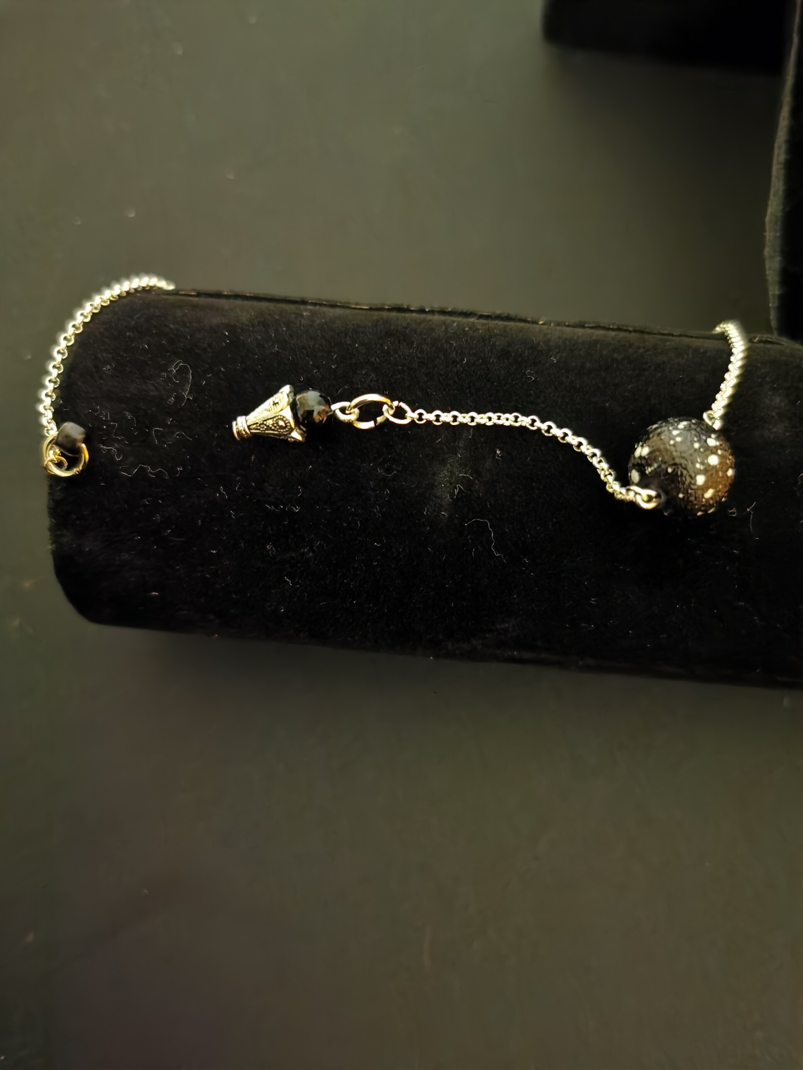 Measuring approximately 32cm in total length, this pendulum features an elegant design. It's crafted with a delicate silver chain, giving it a subtle and stylish appearance. The central focal point is a "power bead"—a round bead in deep black hues with a mesmerizing glitter effect. Its rough, shimmering texture beautifully reflects light, adding mystery and a unique character. It may evoke images of a starry night sky encased in crystal or a cosmic rock! The pendulum is perfectly balanced with a smooth, conical silver pendant at the tip, ensuring precision during energy work.