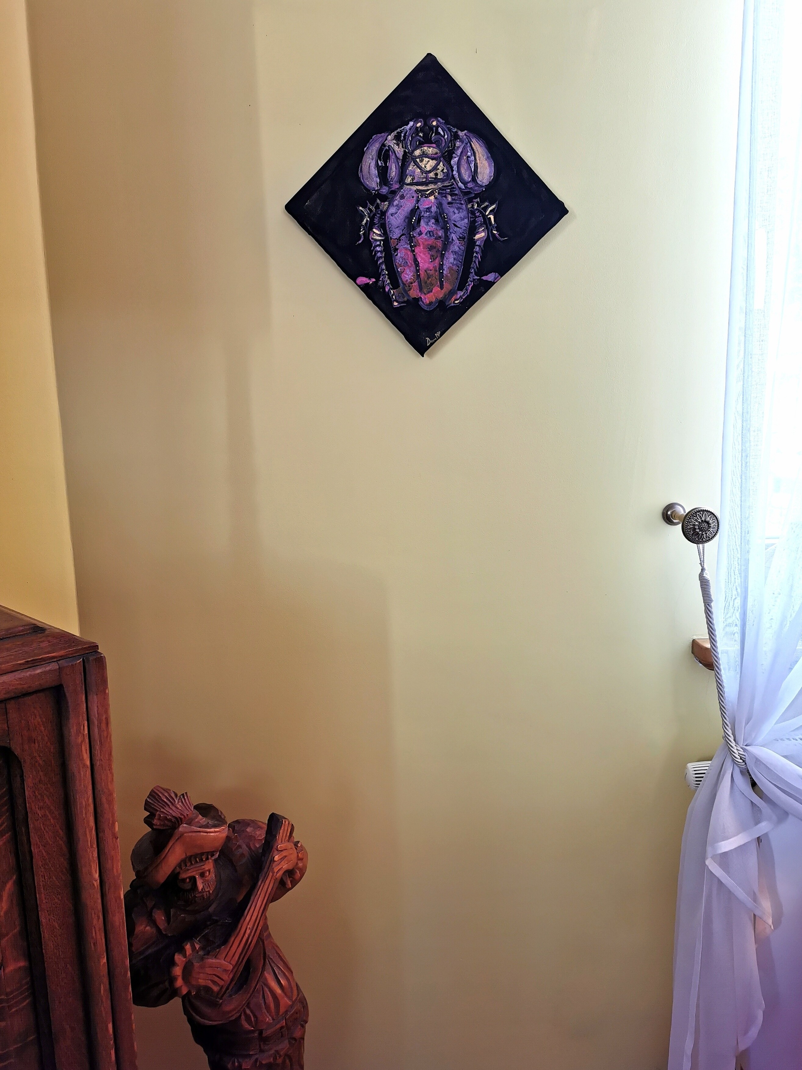 Discover a captivating handcrafted work of art. This unique artwork depicts a beautifully detailed beetle, made using a combination of acrylic paints and intricate beads. The artwork is on a luxurious canvas made from 100% Dormeuil wool. This unique work, now presented in the shape of a diamond, is a stunning piece of modern art. The artwork combines the matte texture of wool with shimmering beads and metallic accents. This artwork will enhance any interior and is perfect for decorators and collectors. Perfect for art collectors, nature enthusiasts or anyone looking for a distinctive piece of decor.