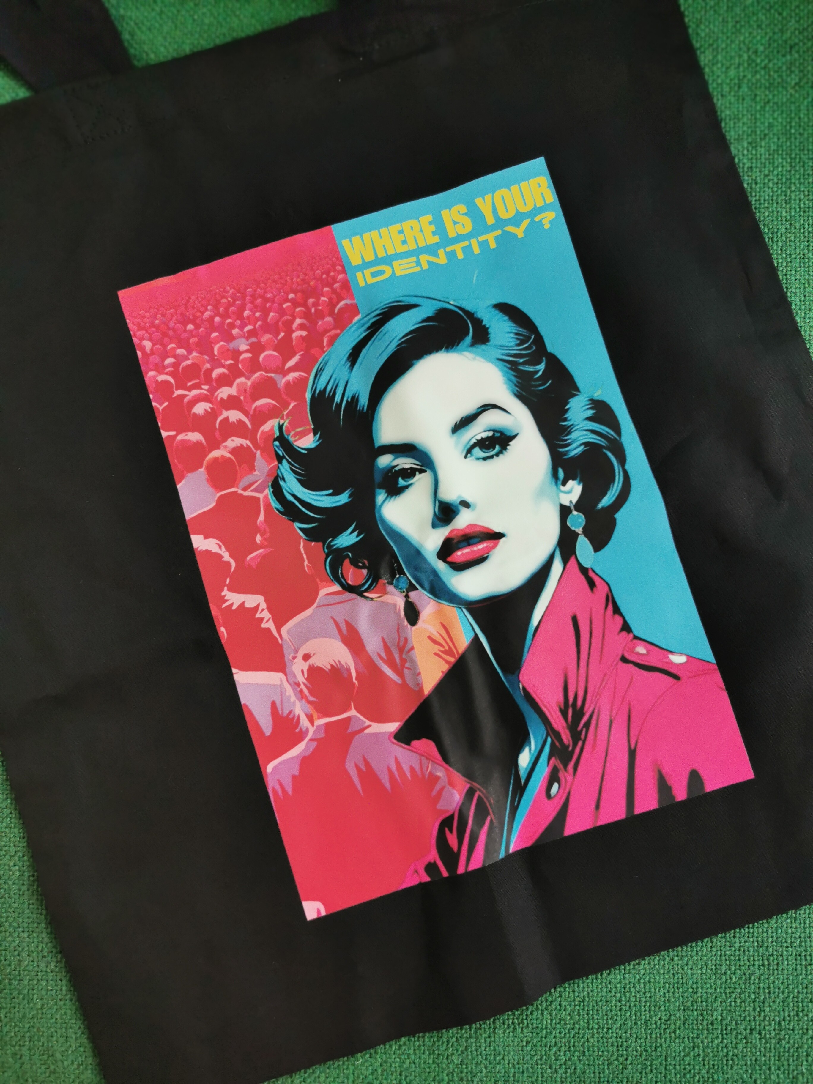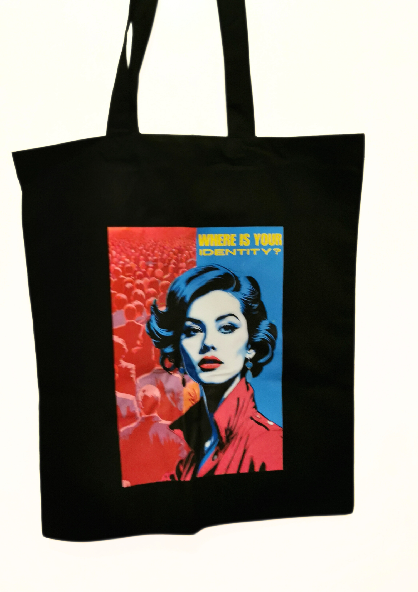 Black cotton shoulder bag in the style of the poster “Where is your identity?