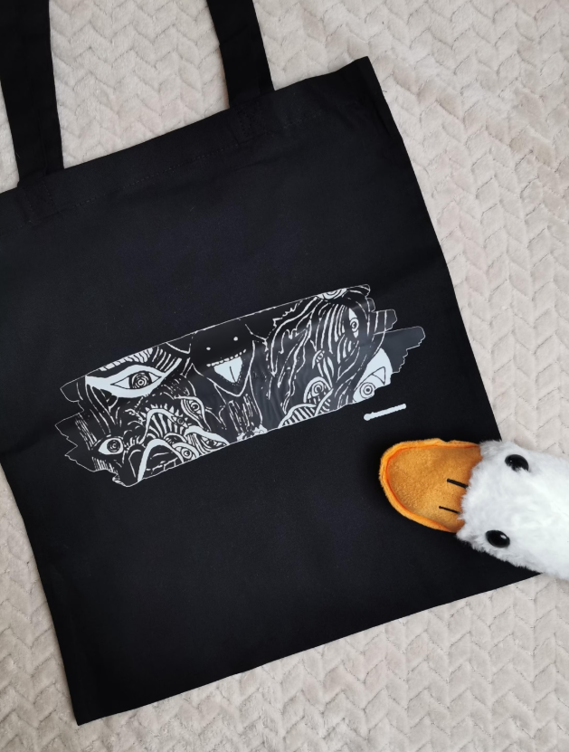 Introducing our unique black cotton shoulder bag with eye-catching cut-out comic book graphics! This stylish and functional bag features a character that represents the expansion of the mind and creativity. Perfect for carrying books, groceries or everyday trinkets, this bag is not only a great conversation starter, but also a great way to express your love of art and comics. Made from high-quality materials, the bag is durable and environmentally friendly. Perfect for anyone who likes vibrant designs and wants to stand out anywhere.