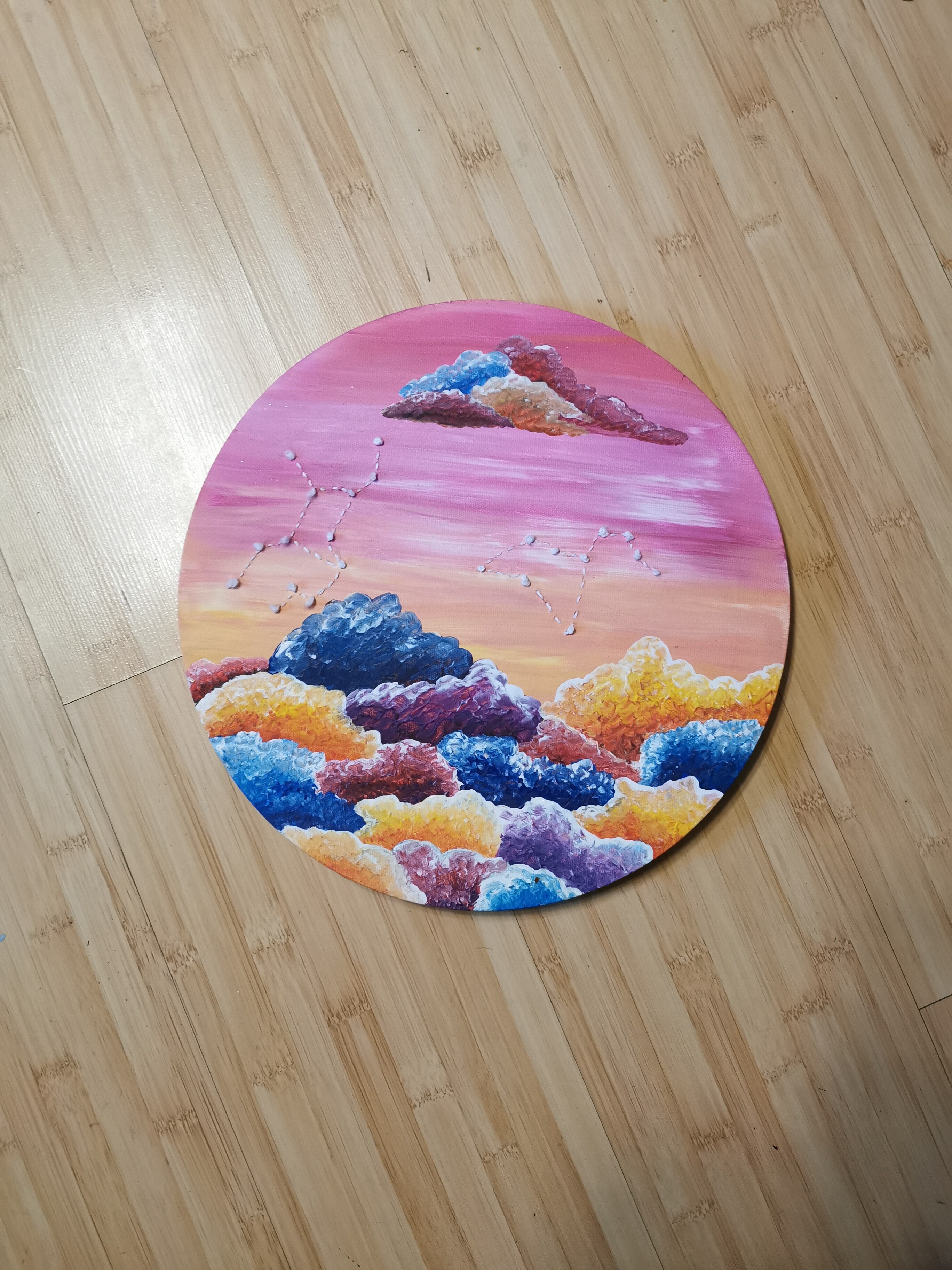 Unique design: The motif of heavenly clouds and the round format make this a standout painting.