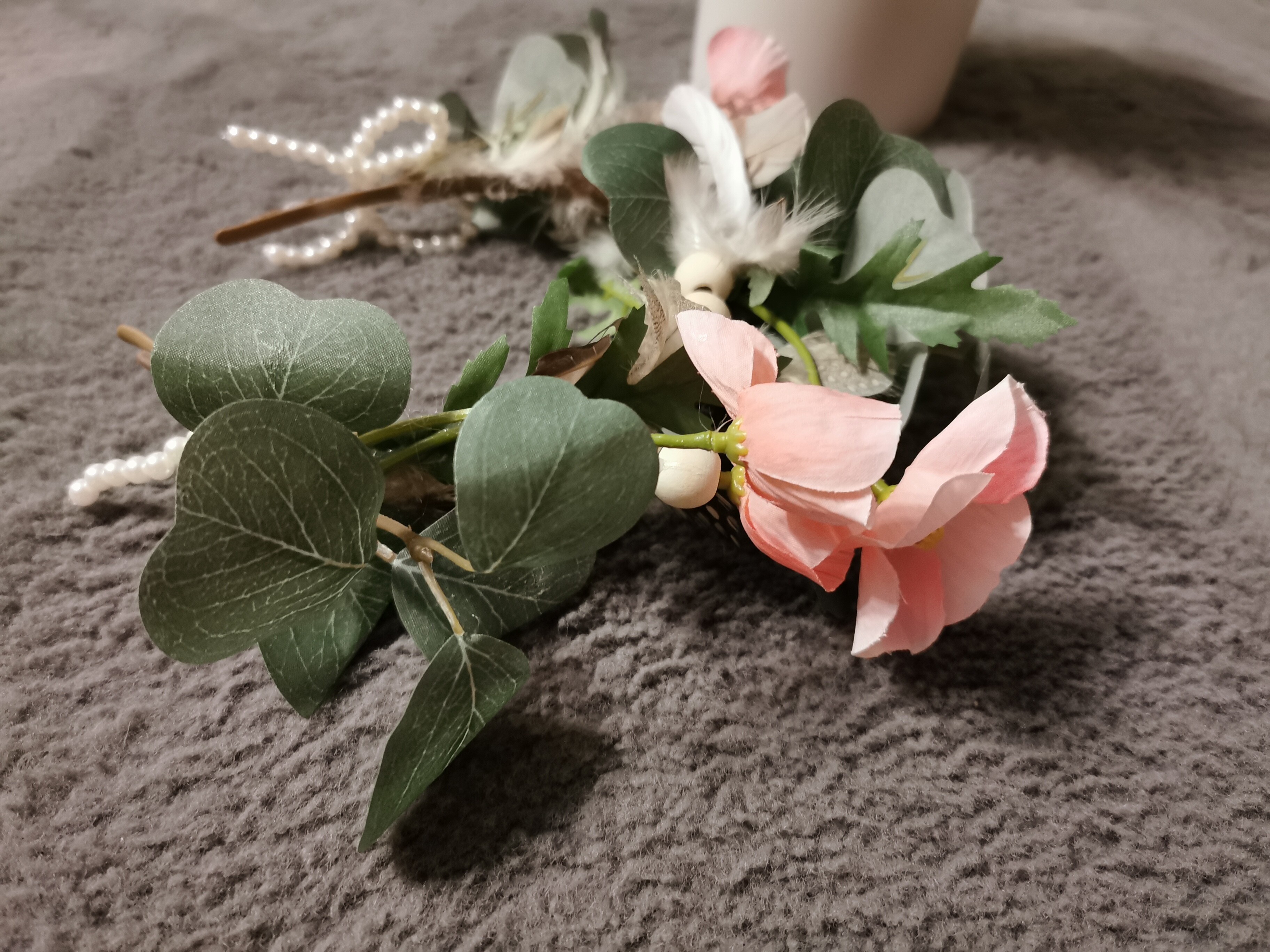 Perfect for weddings, bridal showers, photoshoots, boho gatherings, or whenever you desire a touch of whimsical elegance. This lightweight and versatile hair accessory beautifully complements various hairstyles. Embrace your inner bohemian spirit with this exquisite flower crown. The delicate pearl detailing and the touch of eucalyptus make it a truly unique piece.