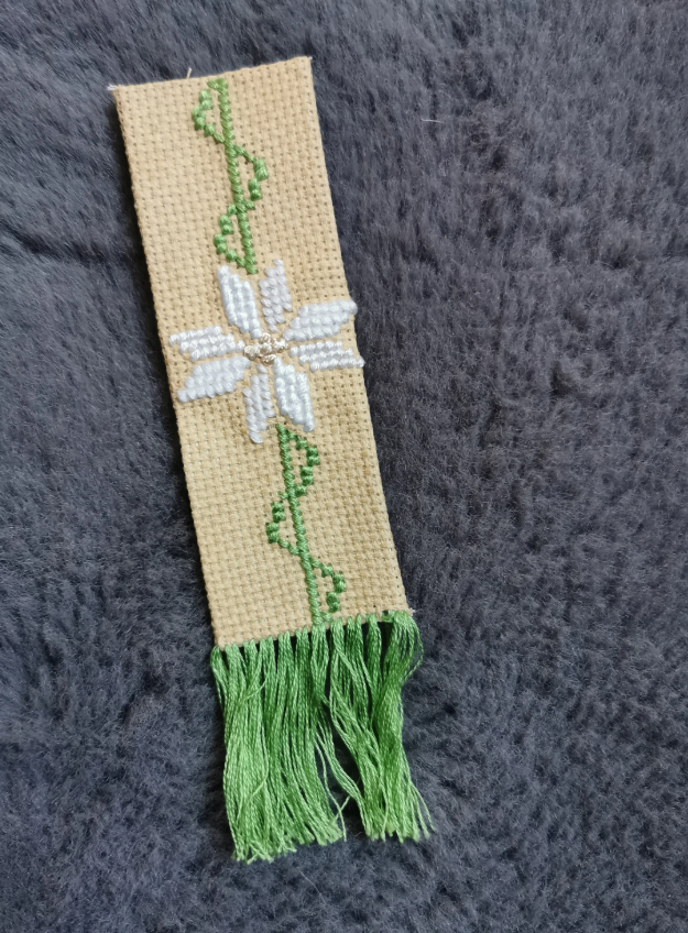 Handmade bookmark - green and beige pattern with white flower.