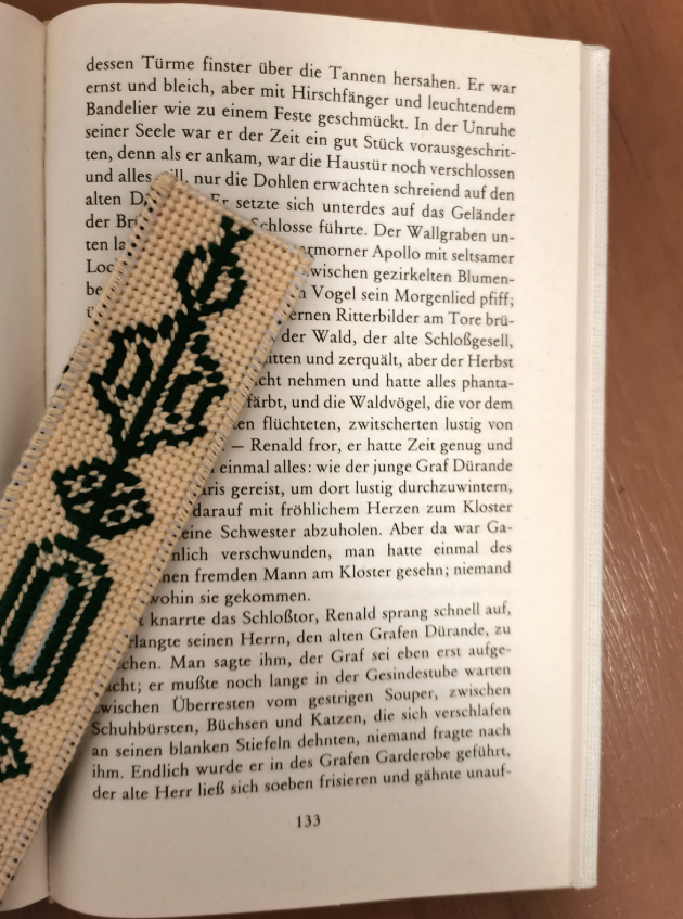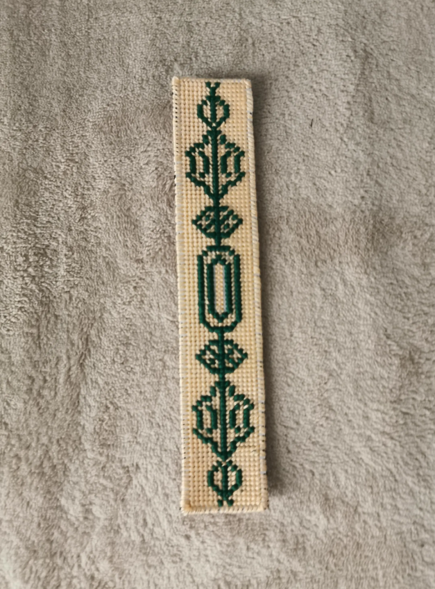 Embroidered bookmark, green cross
