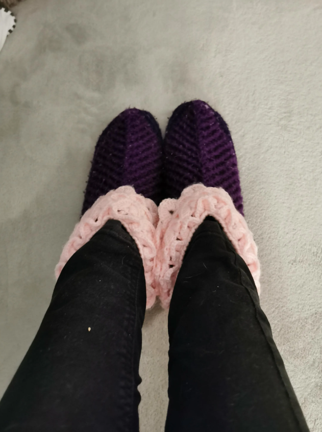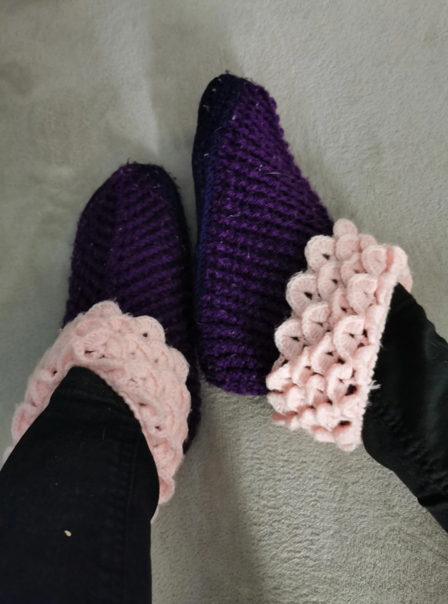 Handmade purple slippers with decorative pink accents