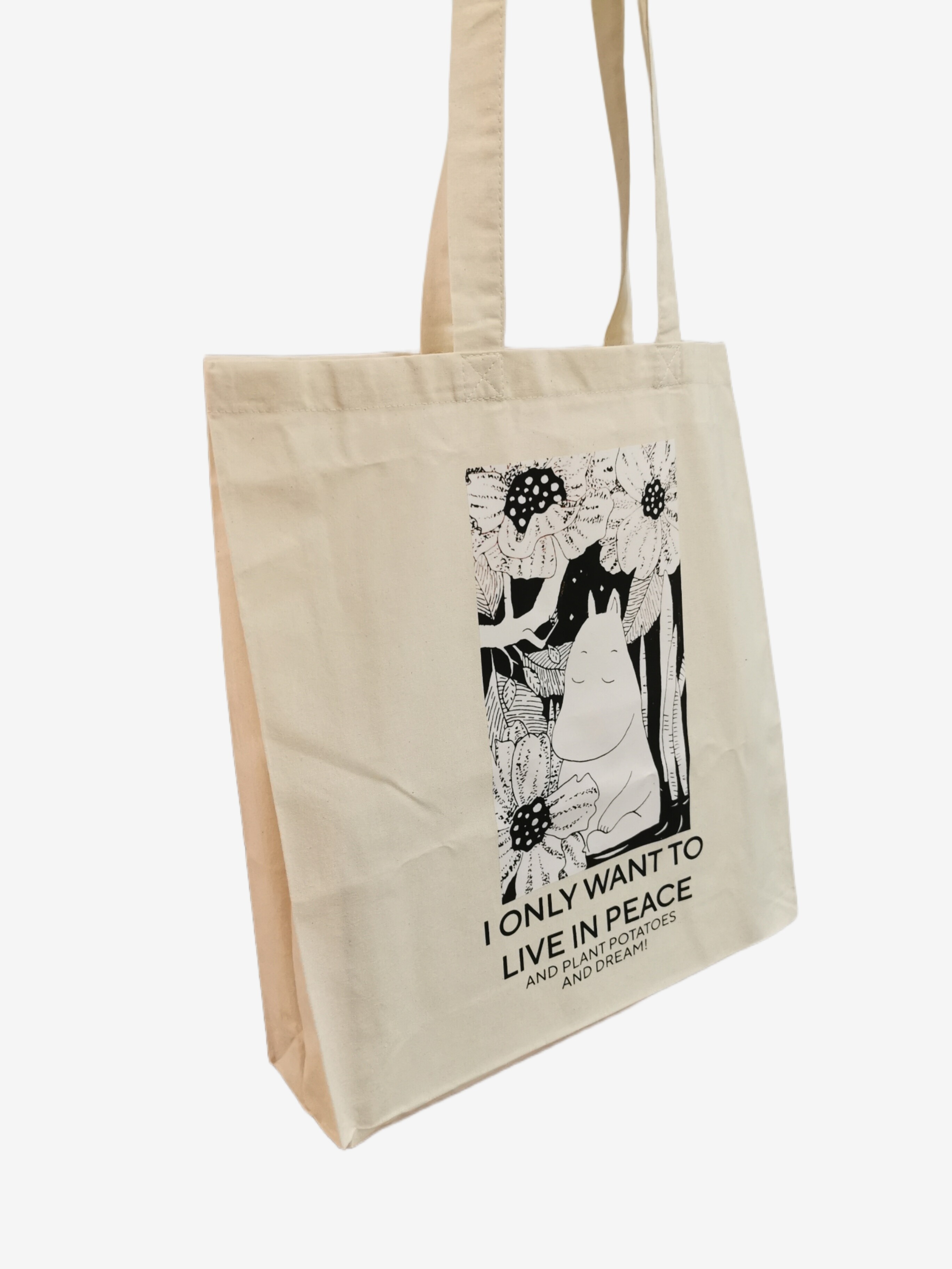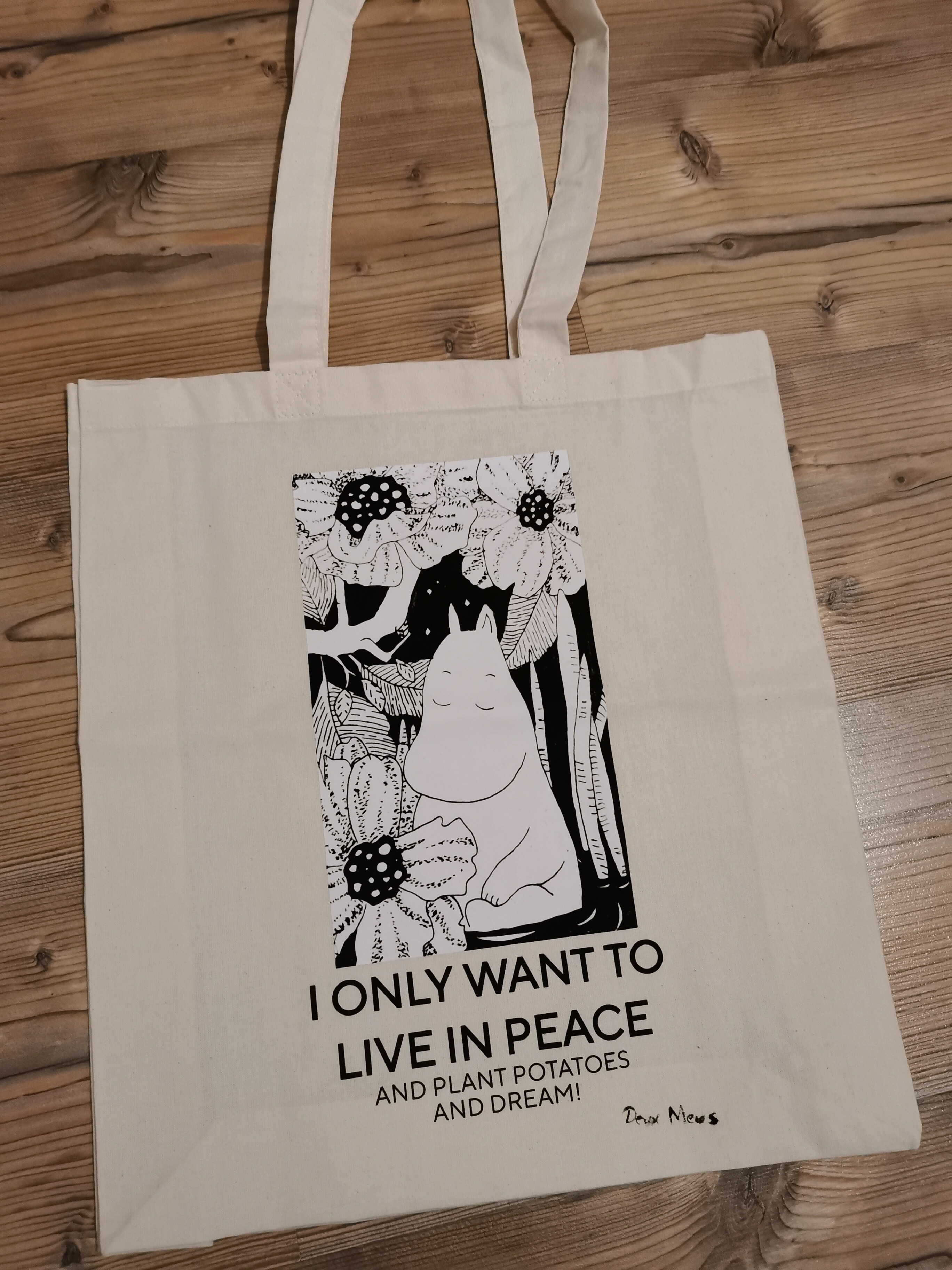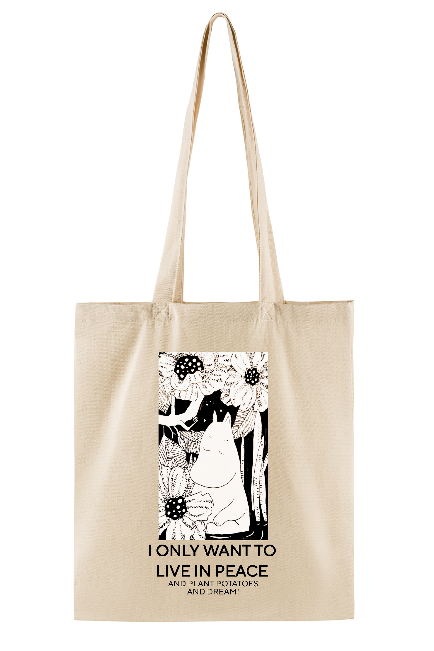 This lightweight bag with a Minuteman is illustrated with a picture and quote I only want to live in peace and plant potatoes and dream!