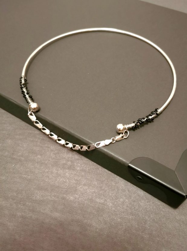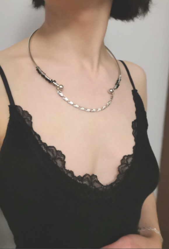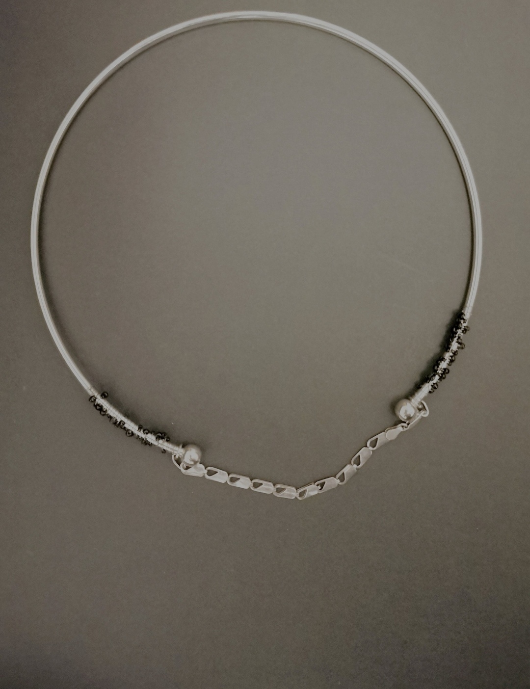 Necklace, a neck ornament on a circle base, made of steel and surgical metal elements.