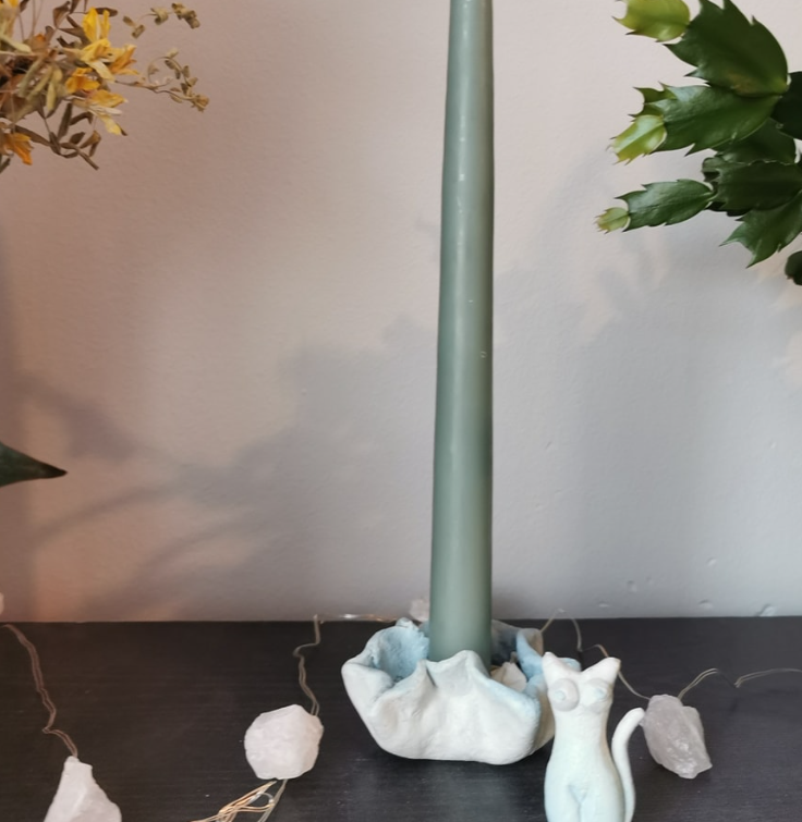 Sculptural Candle Holder: A low, organically shaped holder (ideal for taper or pillar candles) featuring a white and soft blue/grey finish. Its delicate, folded form adds texture and a feeling of calm, flowing movement.