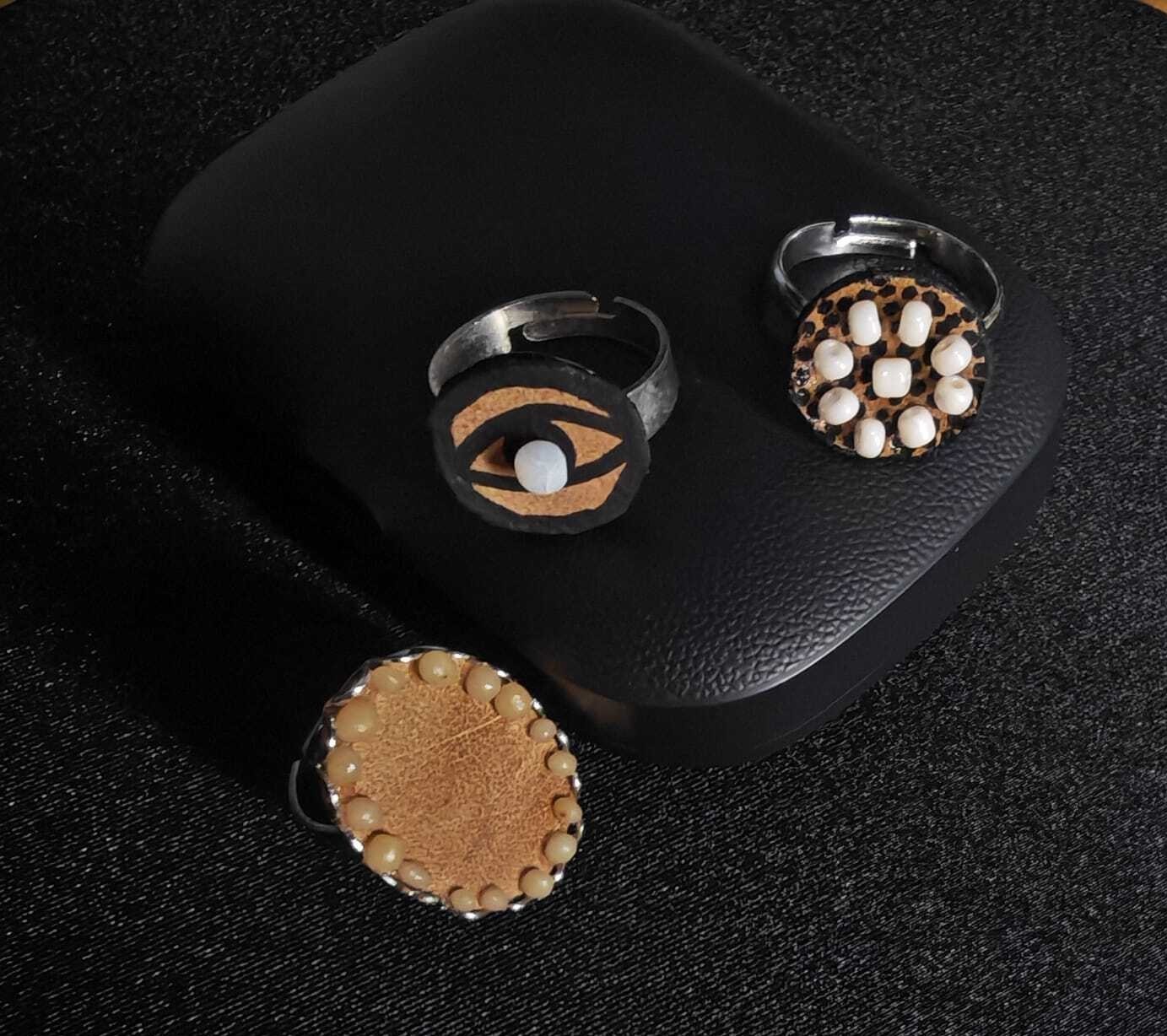 Discover this striking set of three adjustable rings, each a unique work of art handcrafted with elements of genuine leather. This collection features rings with distinct, eye-catching designs: one with a bold, black and tan eye motif, and two with circular patterns accented by small bead details. The adjustable silver-tone band on each ring ensures a perfect and comfortable fit for any finger size, eliminating sizing guesswork. The use of real leather provides a natural, rustic, and quality texture. Perfect for those who love bohemian, unique, statement, or artisan jewelry. Wear them individually for a subtle touch or all together for a layered, bold effect. An ideal gift for a fashion-forward individual who appreciates handmade craftsmanship.