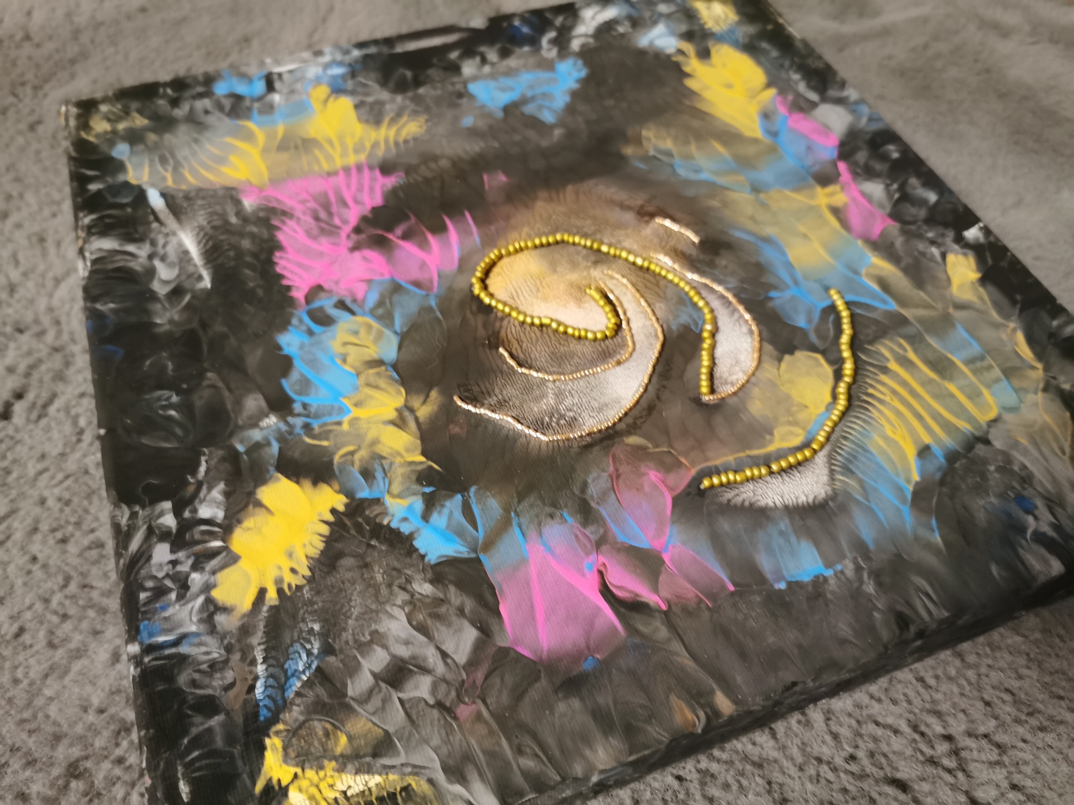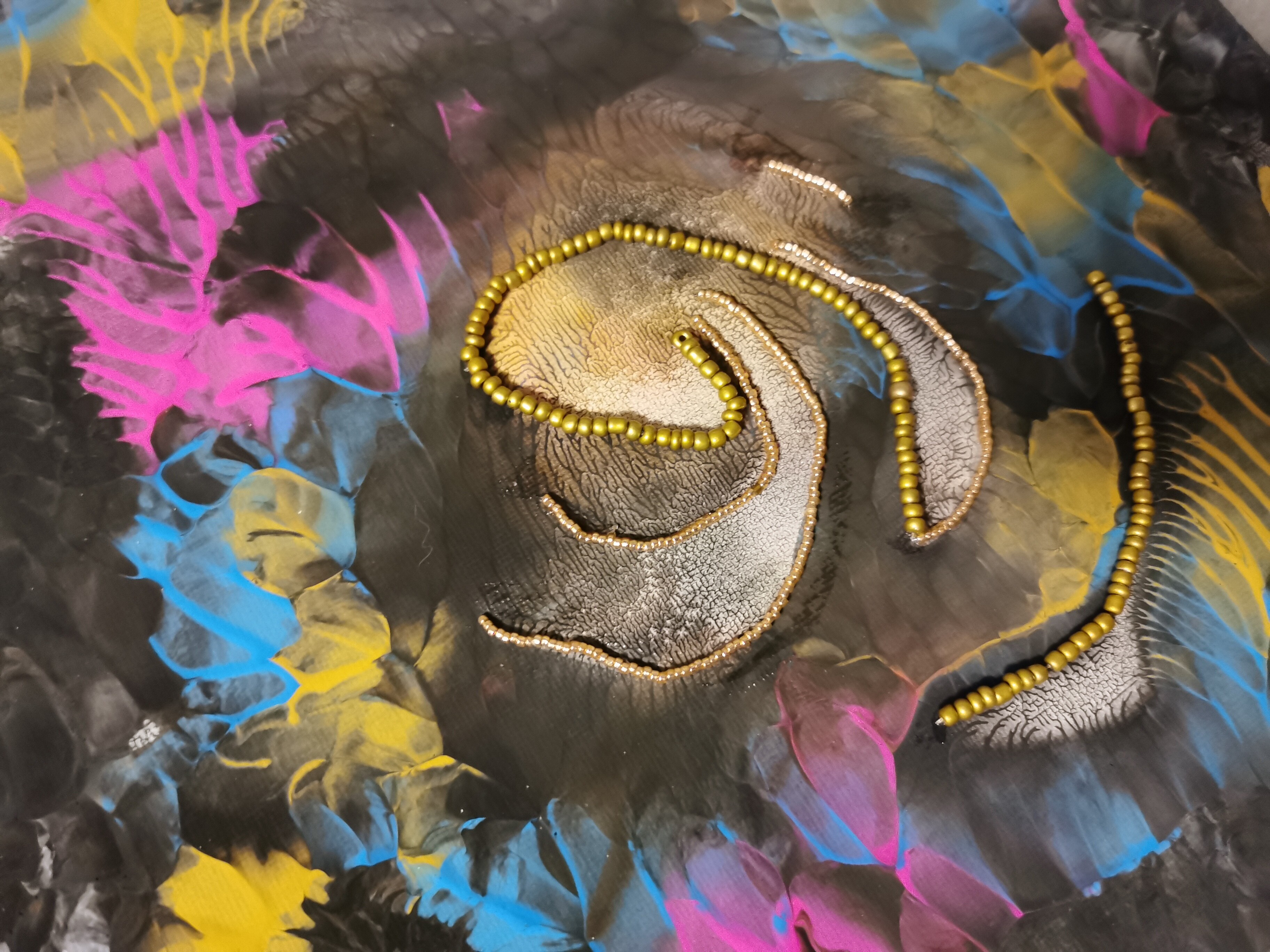 At the heart of the composition lies a luminous spiral in shades of gold and beige. The piece is further elevated by intricate hand-sewn beadwork, adding a stunning 3D dimension that catches the light and creates a sense of perpetual motion.