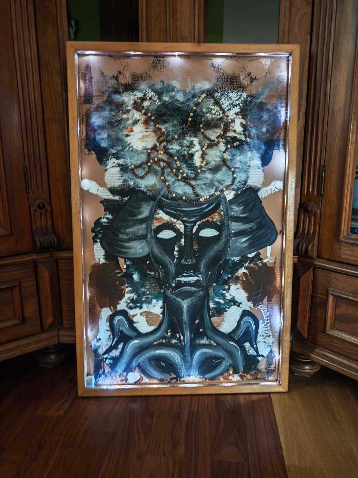 "The Mask of Resource" is more than a painting—it is a profound transformation. This striking art installation was meticulously crafted from a reclaimed cork board and a discarded window blind, proving that profound beauty can be found in what others consider waste.
