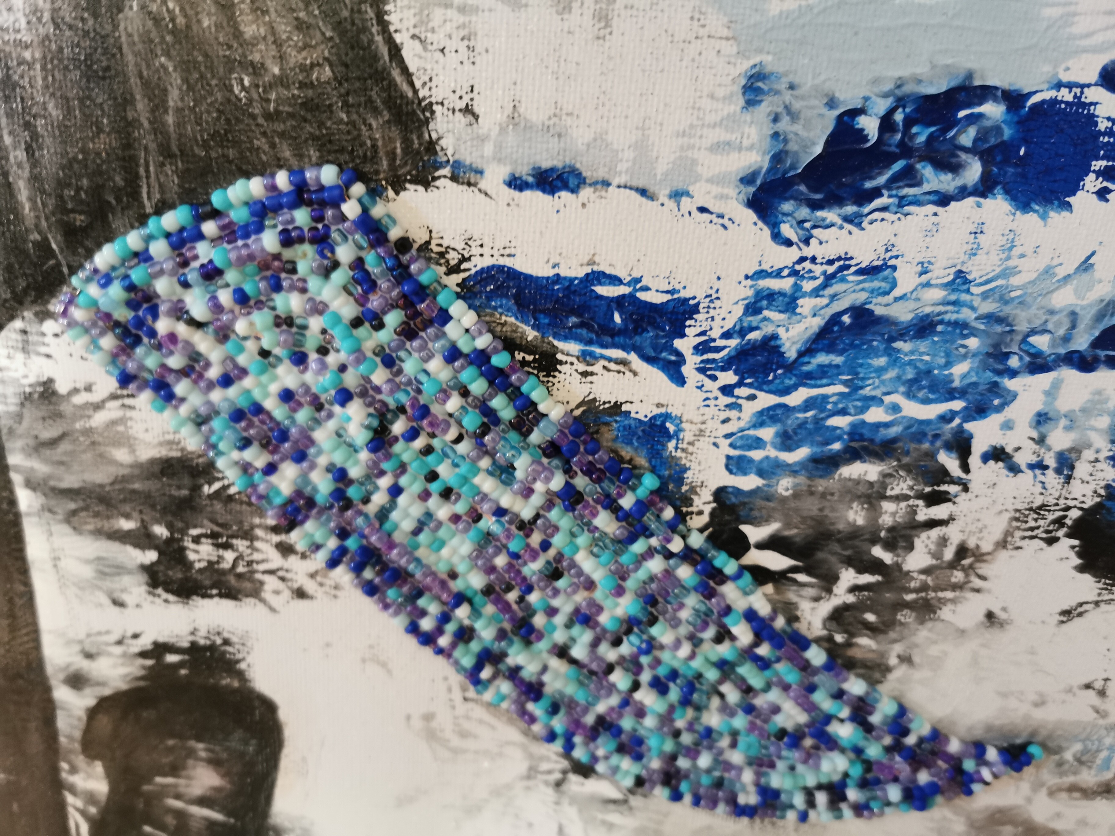 Every single bead has been hand-sewn with incredible precision, adding depth and a three-dimensional quality to the work. The green and blue shades, in harmony with subtle violets and white, create a reflective effect, evoking images of water and nature. This piece is not just a painting; it's a visual story about strength, wisdom, and the infinite number of perspectives one can discover by looking within.