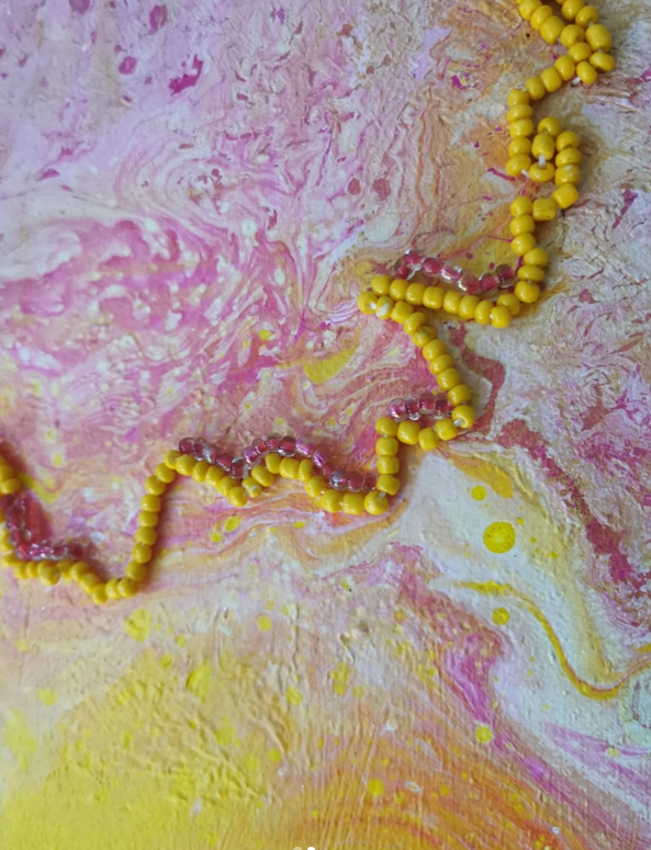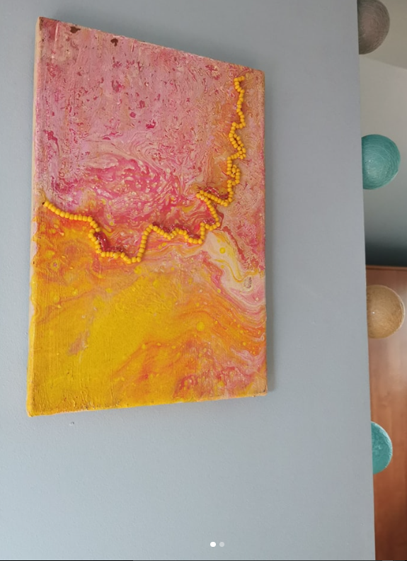 "The Sun" is a vibrant and unique mixed media artwork that radiates warmth and energy. This original piece combines the fluid beauty of acrylic pour painting with the intricate texture of hand-stitched bead embroidery. Rich hues of sun-kissed yellow and fiery orange blend seamlessly with soft pinks, creating a dynamic background that evokes the brilliance of a sunrise or sunset. A shimmering line of carefully placed beads traces a captivating path across the canvas, adding a tactile dimension and a touch of sparkling luxury.