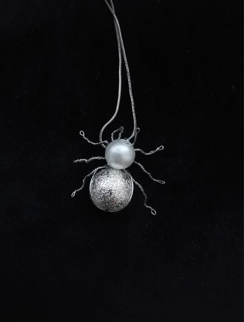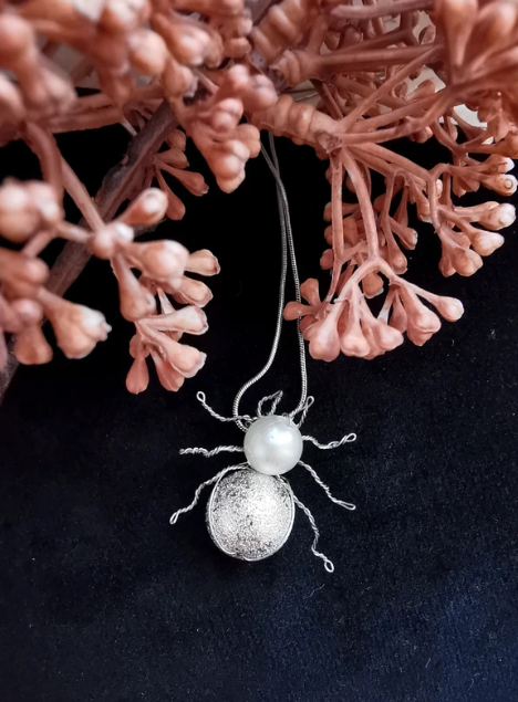 Unique Pearl & Glitter Spider Pendant Charm - Handmade Wire Wrapped Insect Jewelry